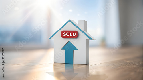 A house with a sold sign and upward arrow symbolizes rising real estate market