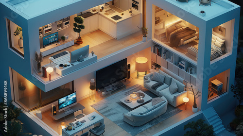 A house with electric devices, tablets and smartphones, computers, notebooks, TV and LED lights. isometric view. Generative AI.