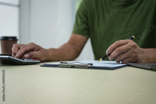 A householder manages household expenses while working at a desk, tracking various costs such as transportation, housing, groceries, dining, healthcare, utilities, and personal items to maintain