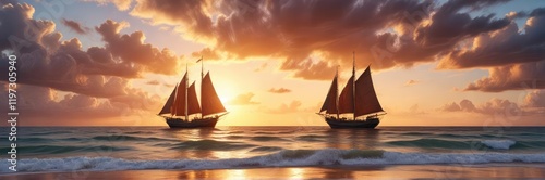A huge sailing boat glides through calm ocean waters at sunset near a sandy beach with a dramatic sky , yacht, waves