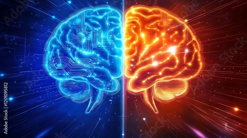 A human brain merging with a digital brain through luminous circuits representing the synergy of technology and human cognition