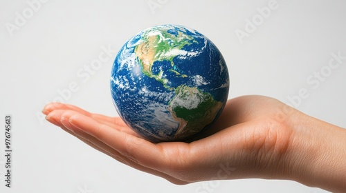A human hand gently cradles a detailed globe, symbolizing care for the Earth and global consciousness about environmental issues.