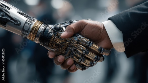 A human hand in a business suit shakes hands with a robotic, metallic hand, symbolizing collaboration between humans and technology.