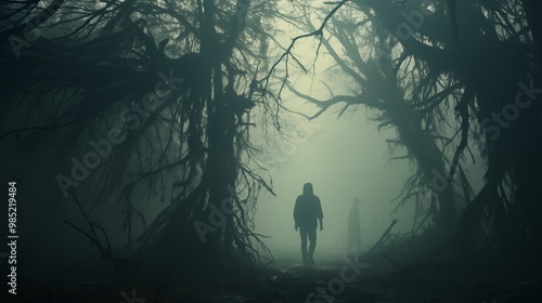 A human-like monster in the misty forest. A zombie standing in the dark forest. Horror or halloween concept. Tall, strange and scary human silhouette. The death waiting.