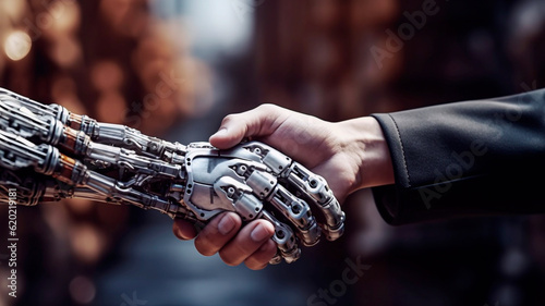 A humanoid robot reaches out its robotic hand to meet a human. Generative AI