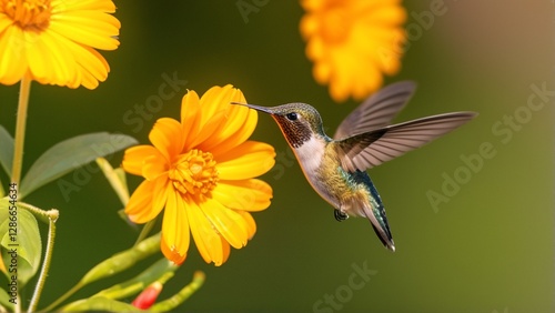 A hummingbird hovers near vibrant orange flowers, delicately sipping nectar.