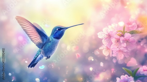 A hummingbird in flight near flowers with blurred colorful background