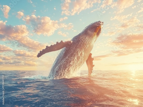 A humpback whale breaches the ocean's surface at sunset, showcasing its majesty.
