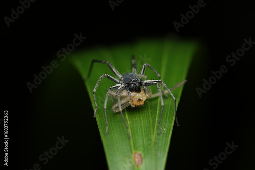 A Huntsman spider (Family Sparassidae, Genus Thelcticopis) on a leaf, capturing a small insect as prey. This highlights its predatory behavior, relying on speed and agility rather than webs to hunt.
