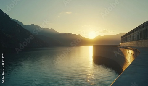 A hydroelectric dam releasing water with powerful currents at sunset, showcasing sustainable energy and industrial infrastructure