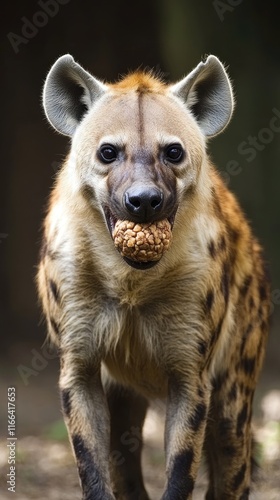 A hyena carrying a food item, showcasing its natural behavior in a wild setting.