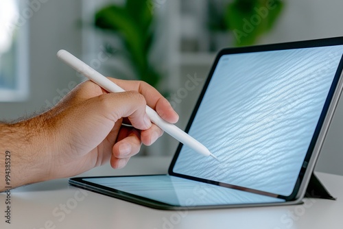 A hyper-realistic close-up of a person’s hand holding a stylus, working from home on a tablet with detailed shadows and textures