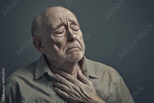 A hyper-realistic depiction of a frail elderly man, his eyes closed, experiencing chest pain, alone against a simple gray backdrop