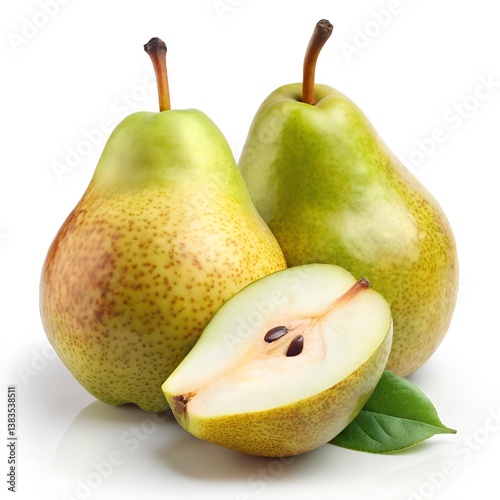 A hyper-realistic, high-resolution image of a fresh pear, one whole and one sliced to reveal the juicy