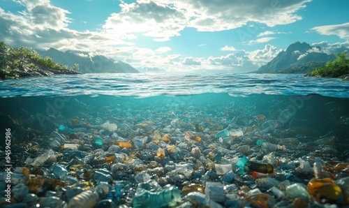 A hyperrealistic illustration showcasing the stark impact of ocean pollution with plastic waste under a bright sky and shimmering water in stunning 8K quality.