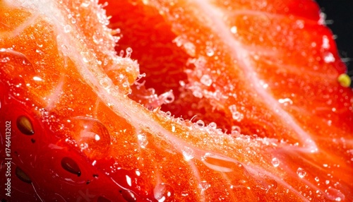 A hyper-realistic macro photograph of a fresh sliced orange covered in glistening water droplets, showcasing the intricate pulp texture and vibrant color