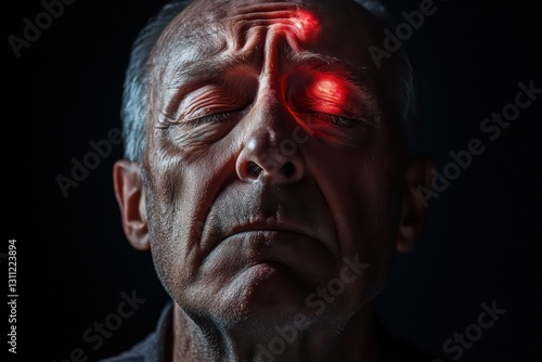 A hyper-realistic portrait of a senior man suffering from a migraine, his eyes shut tight in pain, red inflamed areas glowing on his forehead