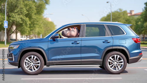 A hyppo is seen sitting in the driver's seat of an SUV, gripping the steering wheel, while parked on a scenic road lined in the city center. Skyscrapers in the blurred background