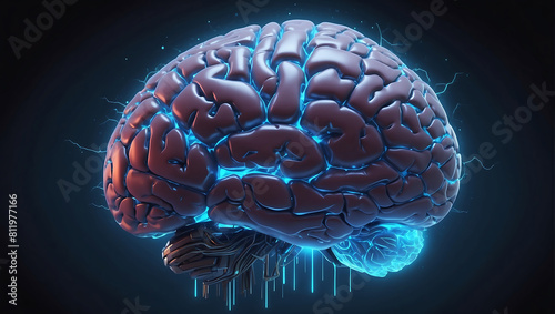 A image of a 3d rendered illustration of a electronic metal human brain with neon growing lightning