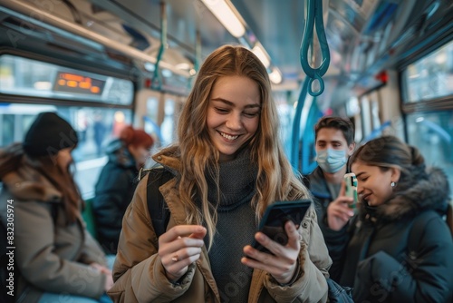 a image of a woman is smiling while looking at her phone