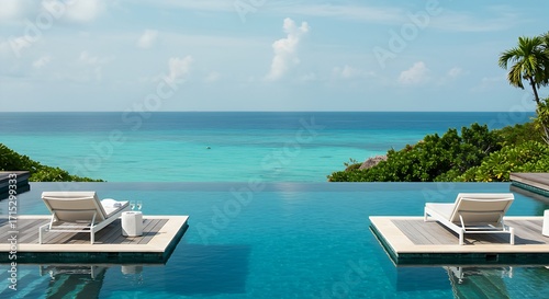 a infinity pool at a tropical resort with two empty,pristine white lounge chairs at the edge.The pool water is a deep blue blending seamlessly with the view of the turquoise ocean,a lush green