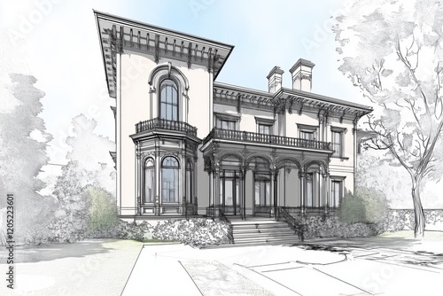 A Italianate house style detailed architectural sketch of a grand mansion featuring intricate designs, large windows, and a prominent entrance with steps. The style is elegant and classic.