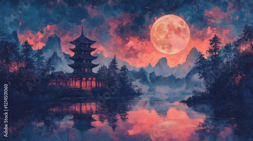 A Japanese pagoda under moonlight surrounded by vibrant clouds, perfect for cultural art, travel designs, and serene visuals.