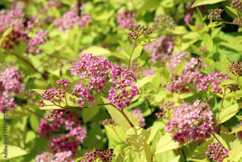 A Japanese spirea (Spiraea japonica) bush is blooming in the garden