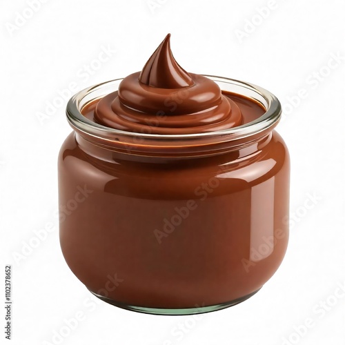 a jar of chocolate sauce with a white background.