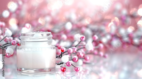 A jar of cream is sitting on a table next to a bunch of pink and white flowers