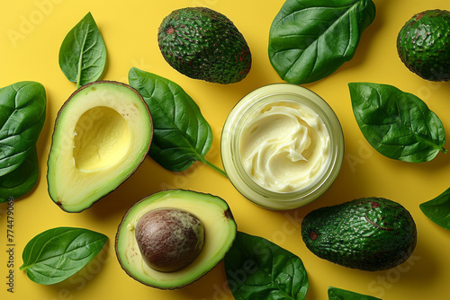 a jar of facial cream and cut avocados against a vivid yellow background,generative ai