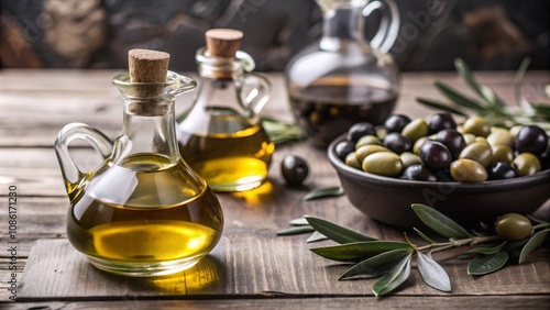 A jar of olive oil and olives.