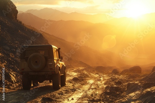 A jeep maneuvers along a dusty dirt road surrounded by towering mountains, showcasing the thrill of off-roading in rugged landscapes