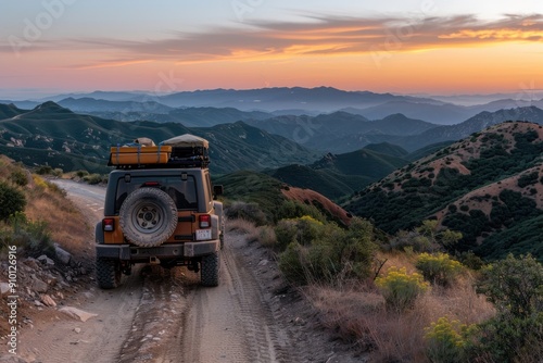A Jeep off-road vehicle on a winding trail through a mountainous region, set against a colorful sunset sky, showcasing adventure and stunning natural beauty.