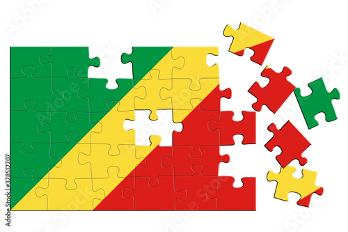 A jigsaw puzzle with a print of the flag of Republic of the Congo, some pieces of the puzzle are scattered or disconnected. Isolated background. 3d illustration