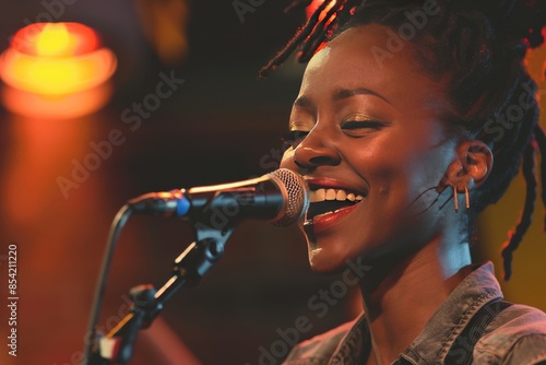 A joyful African American female singer performing at a live music event, showcasing talent and passion