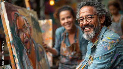 A joyful artist smiles while painting a portrait, accompanied by a woman, in a vibrant, artistic environment filled with creativity.
