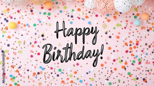 A joyful birthday greeting with "Happy Birthday!" text, colorful confetti, and decorative balloons on a soft pink background. The festive atmosphere makes it perfect for birthday greetings, invitation