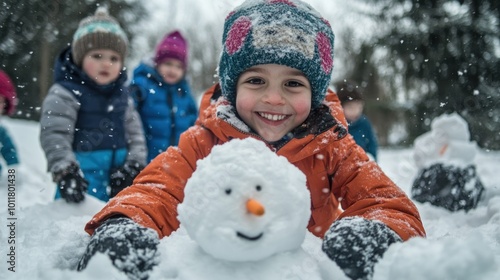 A joyful boy building a snowman in the snow