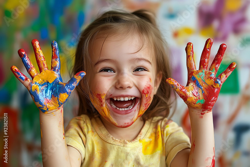 A joyful child girl laughs heartily as she proudly displays her paint-covered hands.