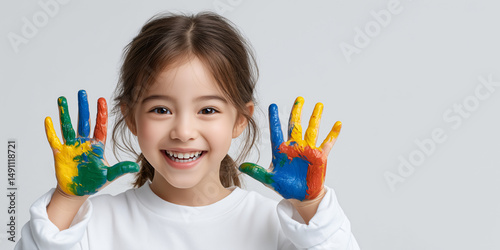 A joyful child proudly displaying her colorful painted hands, radiating happiness and creativity