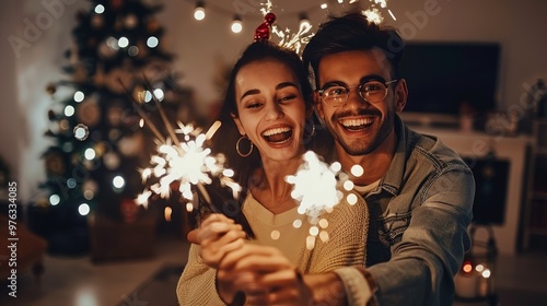 A joyful couple enjoys sparklers together among festive decorations and warm lights, creating lasting memories