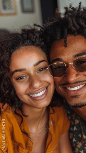 A joyful couple posing for a selfie sharing a warm smile and a close embrace with the man wearing glasses and both dressed in casual vibrant attire.