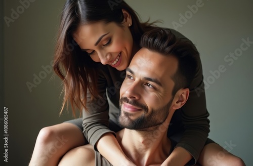 A joyful couple shares a tender moment together in a cozy indoor setting during a tranquil afternoon at home