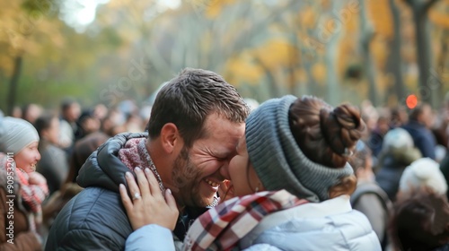 A joyful couple sharing a tender moment and laughing together, surrounded by people in a bustling park during autumn..