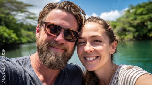 A joyful couple taking a selfie in a lush outdoor setting near a serene body of water