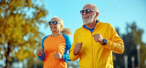 A joyful elderly couple enjoying an outdoor run together, showcasing fitness and vitality