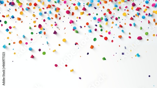 A joyful explosion of colorful confetti pieces scattered across a white background, embodying a festive and celebratory atmosphere.