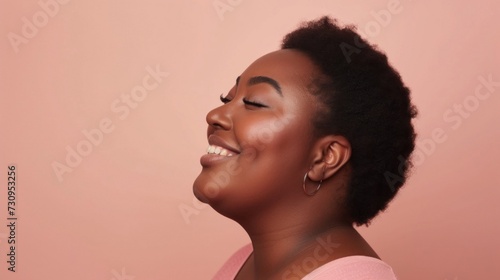 A joyful expression looking up and smiling with their eyes closed.