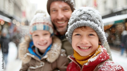 A joyful family enjoying a snowy day on a bustling city street, with children in the foreground and a blurred background of shops and people. Winter attire and snowflakes add charm.